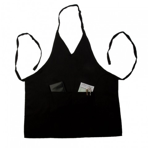 Tuxedo Apron, 28-1/2" x 27", (2) 7" x 7" pocket, (1) 7" x 3" pencil pocket, 32" green cloth ties, 65/35 poly/cotton twill, black (individually packaged with barcode)