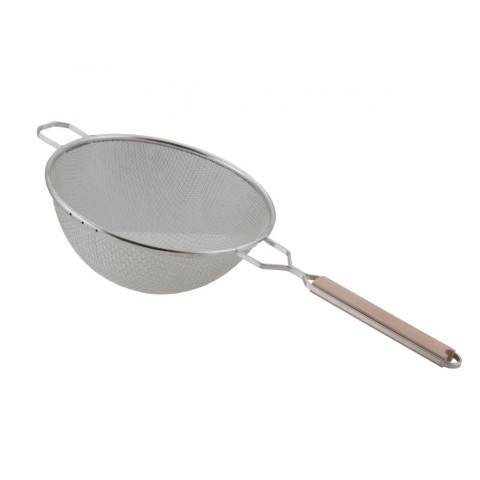 Strainer, 10", stainless steel, medium double mesh, wood handle