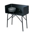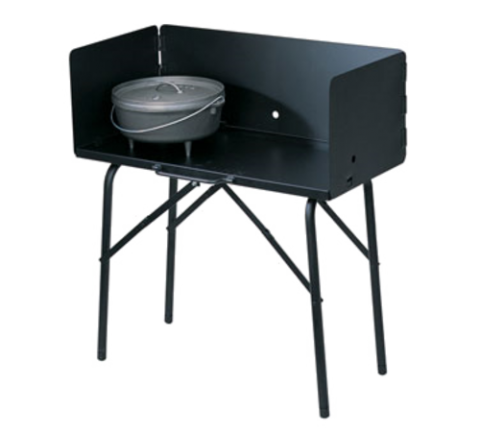 Camp Cooking Table, 32"L x 16"W x 26"H, collapsible, 3-sided attachable windscreen, folding legs, adjustable feet, 1/8" deck thickness, steel construction, high temperature black finish