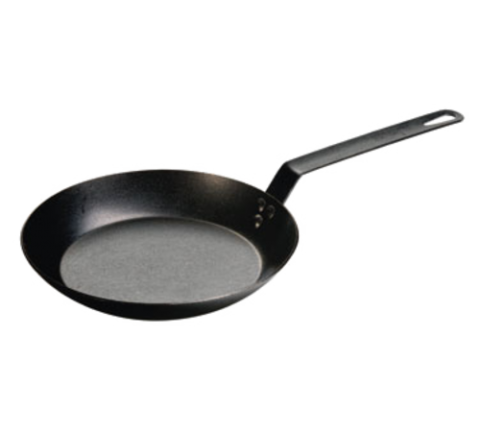 Skillet, 10-5/16" dia. x 3-5/16"H (exterior), riveted handle, stove top/induction/grill/campfire/oven safe, seasoned with oil, hand wash only, heavy gauge carbon steel, Made in USA