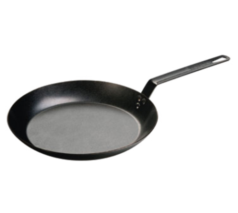 Skillet, 12" dia. x 3-1/2"H (exterior), riveted handle, stove top/induction/grill/campfire/oven safe, seasoned with oil, hand wash only, heavy gauge carbon steel, Made in USA