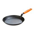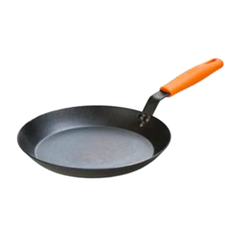 Skillet, 12" dia. x 3-1/2"H (exterior), riveted handle with orange silicone handle holder, stove top/induction/grill/campfire/oven safe, seasoned with oil, hand wash only, heavy gauge carbon steel, Made in USA