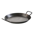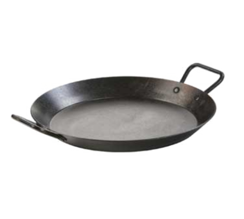 Skillet, 15" dia. x 2-7/10"H (exterior), riveted dual handles, stove top/induction/grill/campfire/oven safe, seasoned with oil, hand wash only, heavy gauge carbon steel, Made in USA