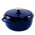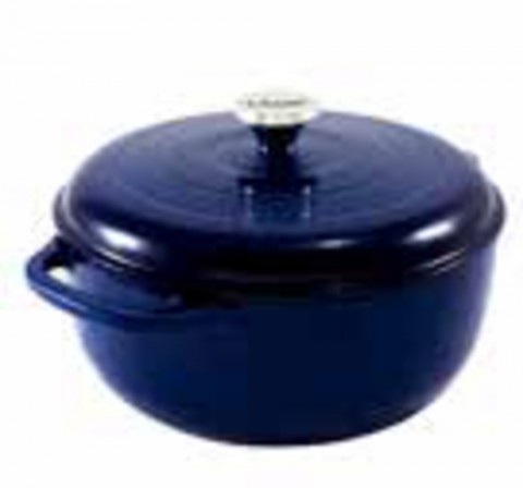 Dutch Oven, 6 quart, 11-3/5" dia. x 6"H (exterior), round, cover with stainless steel knob, refrigerator/gas/electric/ceramic/induction/oven safe up to 500°F, dishwasher safe (hand wash recommended), porcelain enameled cast iron, off-white interior/indigo exterior