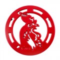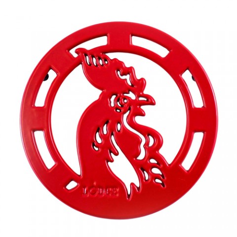 Trivet, 8" dia., round, rooster design, with metal hanger, rubber feet, dishwasher safe (hand wash recommended), porcelain enameled cast iron, red