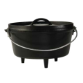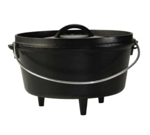 Camp Dutch Oven, 5 quart, 11-1/2" dia. x 7-3/4"H (exterior), flanged lid can be used to hold coals/briquettes (flip lid to use as griddle), (3) integral legs (fire safe), wire bail handle (for use with tripod), includes: Camp Dutch Oven Cooking 101 cookbook, stove top/grill/campfire/oven safe, seasoned with oil, hand wash only, cast iron, Made in USA