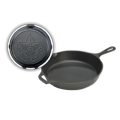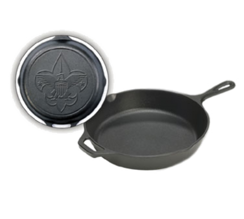 Boy Scout Skillet, 12" dia. x 2-3/10"H (exterior), round, officially licensed, fleur-de-lis engraved on the bottom, with helper handle, stove top/induction/grill/campfire/oven safe, seasoned with oil, hand wash only, cast iron, Made in USA