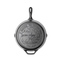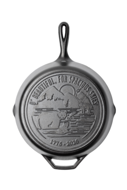 Spacious Skies Logo Skillet, 12-9/16" dia. x 2-1/4"H (exterior), round, with helper handle, stove top/induction/grill/campfire/oven safe, seasoned with oil, hand wash only, cast iron, Made in USA