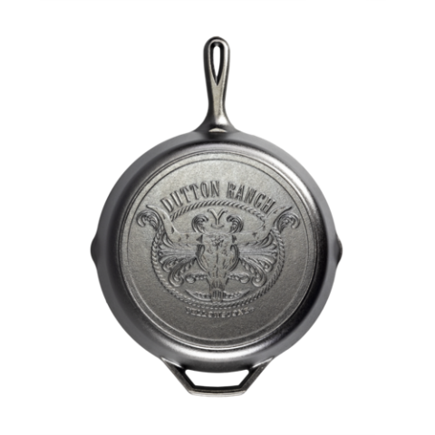 Yelllowstone Steer Skillet, 12-9/16" dia. x 2-1/4"H (exterior), round, with helper handle, stove top/induction/grill/campfire/oven safe, seasoned with oil, hand wash only, cast iron, Made in USA