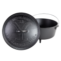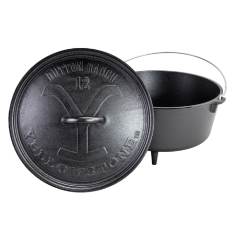 Yellowstone Camp Dutch Oven, 8 quart, 13-2/5" dia. x 8-3/5"H (exterior), "power Y' design, flanged lid can be used to hold coals/briquettes (flip lid to use as griddle), (3) integral legs (fire safe), wire bail handle (for use with tripod), includes: Camp Dutch Oven Cooking 101 cookbook, stove top/grill/campfire/oven safe, seasoned with oil, hand wash only, cast iron, Made in USA