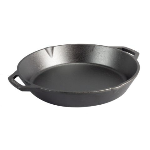 Pan, 13-1/4" dia., dual handle, stove top/induction/grill/campfire/oven safe, seasoned cast iron, PFOA & PTFE free material, Made in the USA