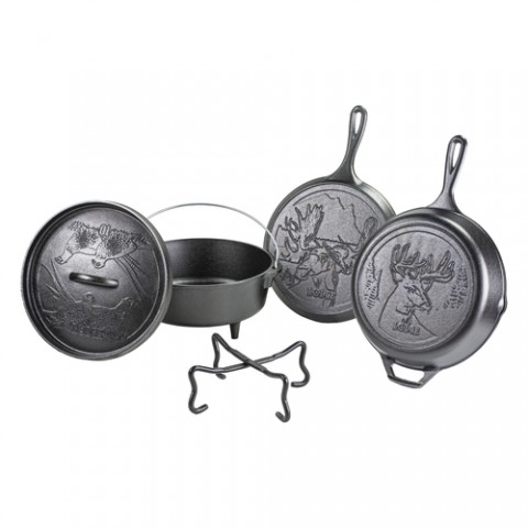 Wildlife Series™ Cookware Set, 5-piece, includes: (1) 10-1/2" dia. griddle with moose scene, (1) 10-1/4" dia. griddle with deer scene, (1) 4 quart (10" dia.) camp dutch oven, (1) 10" dia. camp lid with pheasant scene and (1) 4-in-1 camp dutch oven tool, stove top/induction/grill/campfire/oven safe, seasoned with oil, hand wash only, cast iron, Made in USA (griddles and dutch oven)