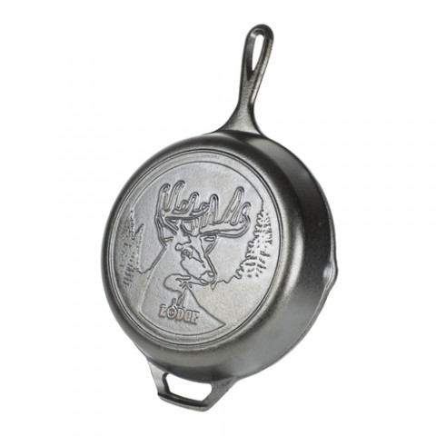 Wildlife Series™ Skillet, 10-11/16" dia. x 2-1/10"H (exterior), round, with helper handle, "deer scene" design, stove top/induction/grill/campfire/oven safe, seasoned with oil, hand wash only, cast iron, Made in USA