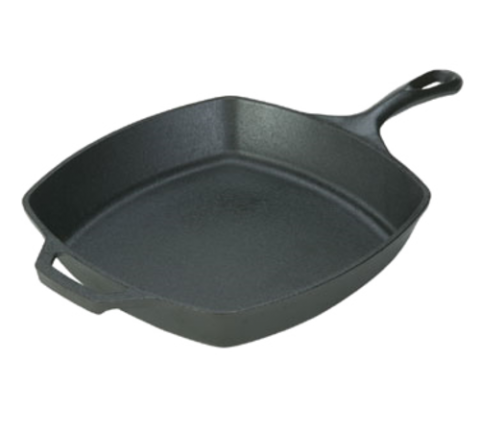 Skillet, 10-1/2" x 2-5/8"H (exterior), with helper handle, square, stove top/induction/grill/campfire/oven safe, seasoned with oil, hand wash only, cast iron, Made in USA