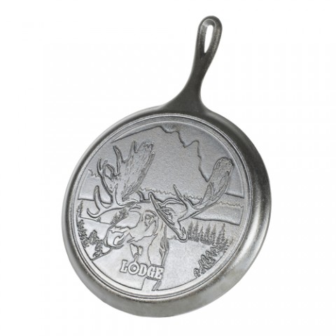 Wildlife Series™ Skillet, 10-5/8" dia. x 1-1/2"H (exterior), round, "moose scene" design, stove top/induction/grill/campfire/oven safe, seasoned with oil, hand wash only, cast iron, Made in USA