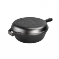 Wanderlust Combo Cooker, 3.2 quart, includes: deep skillet base, 10-1/2" dia. x 3"H (exterior), shallow skillet/griddle lid, 10-1/2" dia. x 1-3/5"H (exterior), stove top/induction/grill/campfire/oven safe, seasoned with oil, hand wash only, seasoned cast iron, PFOA & PTFE free material, Made in the USA