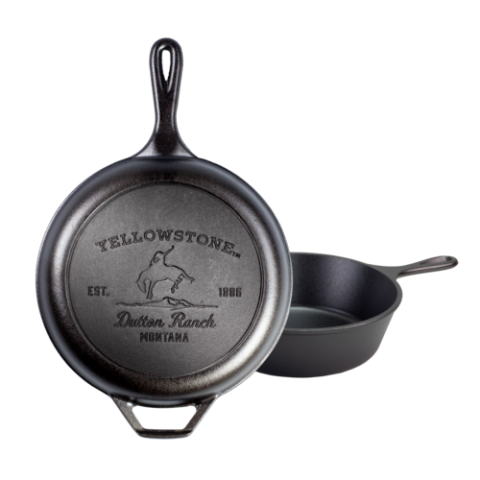 Yellowstone Combo Cooker, 3.2 quart, includes: deep skillet base, 10-4/5" dia. x 4"H (exterior), "bucking bronco" design, shallow skillet/griddle lid, stove top/induction/grill/campfire/oven safe, seasoned with oil, hand wash only, cast iron, Made in USA