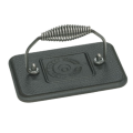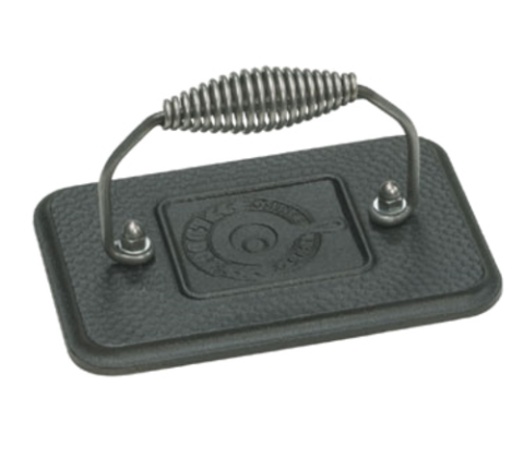 Grill Press, 6-3/4" x 4 1/2", rectangular, cool grip spiral handle, stove top/grill/campfire/oven safe, seasoned with oil, hand wash only, cast iron, hammered finish, Made in USA