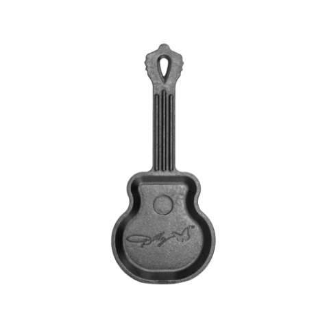 Dolly Skillet, 4-7/10"W x 10-3/4"D x 7/8"H (exterior), guitar shaped, with helper handle, stove top/induction/grill/campfire/oven safe, seasoned with oil, hand wash only, cast iron, Made in USA