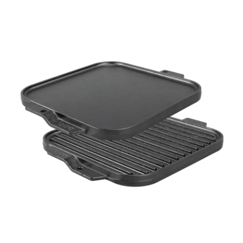 Griddle, 10-1/2" x 10-1/2", square, single burner, reversible, (1) smooth surface & (1) ribbed surface, with handles, raised edges, stove top/grill/campfire/oven safe, seasoned with oil, hand wash only, cast iron, Made in USA
