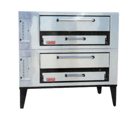 Pizza Oven, Deck Type, gas, stacked (2) 7"H x 36" x 48" baking chambers, (4) 18" pie capacity per deck , 2" thick brick decks, 300 - 650° thermostats, stainless steel top, front, doors & sides, aluminized steel interior, adjustable legs, 190,000 BTU, UL, UL EPH Classified, Made in USA