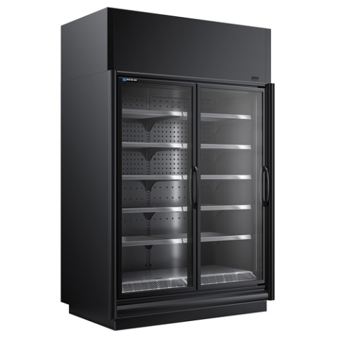 Endless Medium-Temperature Merchandiser, self-contained, 67" W, (2) 30" W hinged glass door sections (field reversible), (10) cantilever shelves with tag molding, LED lighting, black painted textured galvanized steel interior & exterior, add 20 inches to height for top shroud (shipped loose), bottom mount coil, MHMD002EB-ENQ condensing unit, cULus, UL EPH Classified, Made in USA (SPECIAL ORDER - Contact factory for availability)