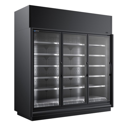 Endless Medium-Temperature Merchandiser, self-contained, 97.44" W, (3) 30" W hinged glass door sections (field reversible), (15) cantilever shelves with tag molding, LED lighting, black painted textured galvanized steel interior & exterior, add 20 inches to height for top shroud (shipped loose), bottom mount coil, MHMD002EB-ENQ condensing unit, cULus, UL EPH Classified, Made in USA (SPECIAL ORDER - Contact factory for availability)