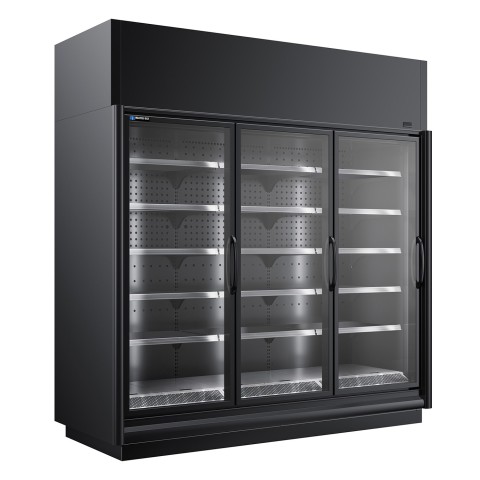 Endless Medium-Temperature Merchandiser, self-contained, 92.44" W, (3) 30" W hinged glass door sections (ends are not included), (15) cantilever shelves with tag molding, LED lighting, painted textured galvanized steel interior & exterior, add 20 inches to height for top shroud (shipped loose), bottom mount coil, MHMD002EB-ENQ condensing unit, cULus, UL EPH Classified, Made in USA (SPECIAL ORDER - Contact factory for availability)