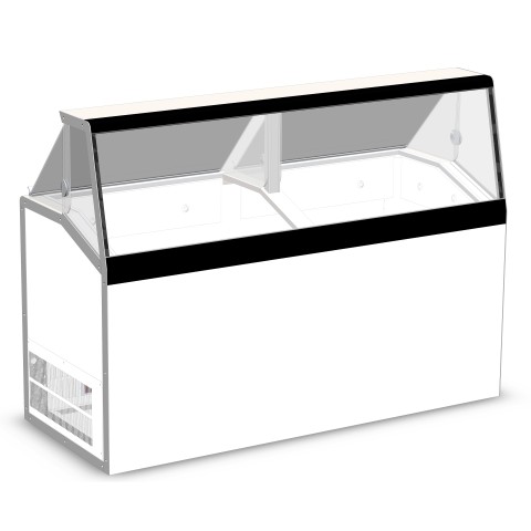 Ice Cream Dipping/Display Cabinet, low-glass (12) 3 gallon can display, (8) 3 gallon storage, painted galvanized steel interior and exterior, 50" high stainless steel serving deck, low front glass view windows, LED interior lighting with switch, temperature range 5° to -5°F, 5/6 HP, 115v/60/1-ph, 7.2 amps, NEMA 5-15P, cULus, UL EPH Classified