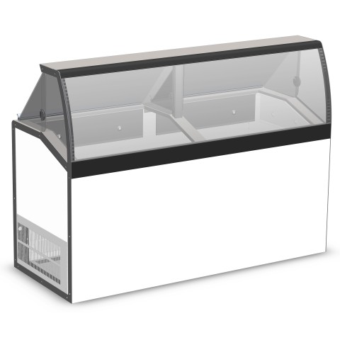 Ice Cream Dipping/Display Cabinet, low-glass, (12) 3 gallon can display, (8) 3 gallon storage, painted galvanized steel interior and exterior, 50" high stainless steel serving deck, curved glass view windows, LED interior lighting switch, temperature range 5° to -5°F, 5/6 HP, 115v/60/1-ph, 7.2 amps, NEMA 5-15P, cULus, UL EPH Classified