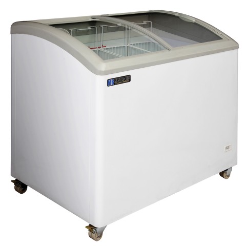 COLDIN-3™ Display Freezer, 9.7 gross cu. ft., curved tempered glass sliding lids, (4) standard baskets, (4) basket dividers, external analog thermometer and lock, white zinc-coated enamel steel exterior, painted white steel interior with LED lighting, defrost water drain, temperature range -18° to 10°F (-27° to -12° C), self-contained refrigeration, heavy duty 2" casters, R290 Hydrocarbon refrigerant, 3/8 hp, 115v/60/1-ph, 1.4 amps, 6-1/2' cord, NEMA 5-15P, cETLus, ETL-Sanitation