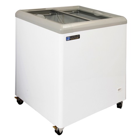 COLDIN-3™ Display Freezer, 7.4 gross cu. ft. (5.8 net cu. ft.), flat tempered glass sliding lids, (2) standard baskets with integrated dividers, external analog thermometer and lock, white zinc-coated enamel steel exterior, painted white steel interior with LED lighting, defrost water drain, temperature range -18° to 10°F (-27° to -12° C), self-contained refrigeration, heavy duty 2" casters, R290 Hydrocarbon refrigerant, 1/3 hp, 115v/60/1-ph, 1.3 amps, 6-1/2' cord, NEMA 5-15P, cETLus, ETL-Sanitation