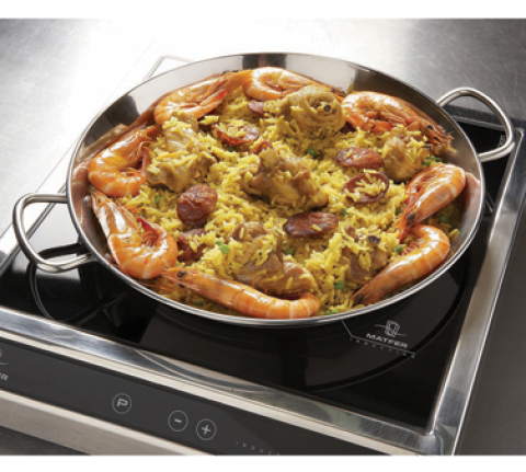 Paella Pan, 12-1/2" dia. x 1-1/2"H, sandwich bottom-stainless steel, aluminum, stainless steel, 2 handles, suitable on gas, electric, ceramic, halogen, and induction hobs