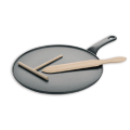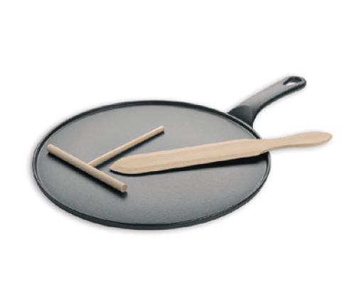 Le Chasseur Crepe Pan, 11-3/4" dia., with beech wood spatula and scraper, cast iron, black, suitable for gas, electric, ceramic, halogen, and induction hobs, (made in France)