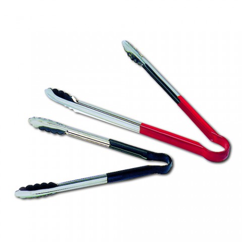 All Purpose Tongs, 9-1/2"L, one-piece, non-skid PVC coated handle, stainless steel, black