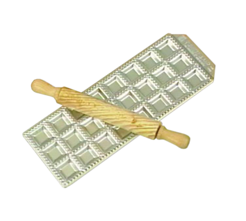 Imperia Ravioli Mold, 10-2/3"L x 5-1/2"W, makes (36) 1-3/8" x 1-3/8" squares, includes wooden rolling pin, pressed aluminum on steel base with rubber feet, 5-year warranty