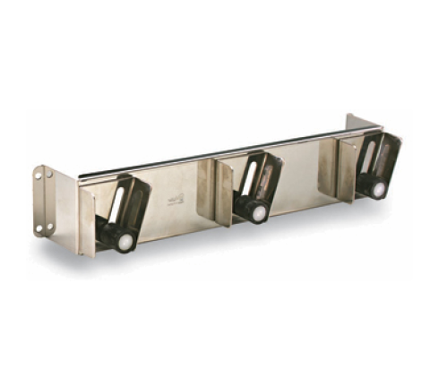 Wall Rack Holder, 14"L x 2-7/8"W, holds 3 utensils with round handle of 3/4" to 1-1/4" dia., 2-1/3” from wall, plastic rollers, includes 4 screws and pins, stainless steel