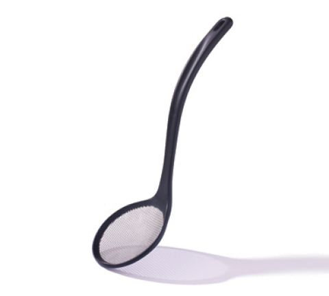 Exoglass® Skimmer, 16-1/6"L x 4 3/4" dia., single piece 3mm mesh, curved handle and hanging loop, heat resistant up to 200°C (392°F), dishwasher safe, heat insulated material (made in France)