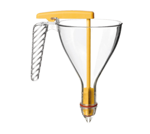 Automatic Funnel, 3/4 quart, 5-1/2" dia., comfort grip, watertight joint, dishwasher safe, polycarbonate, transparent, includes: a chrome-plated wire stand and 1 nozzle 1/6" diameter, made in France