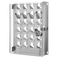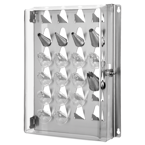 Pastry Tip Rack, 9-7/8"L x 3-1/3"W x 13"H, holds (24) tips, includes wall plugs and screws, transparent polycarbonate door, stainless steel base