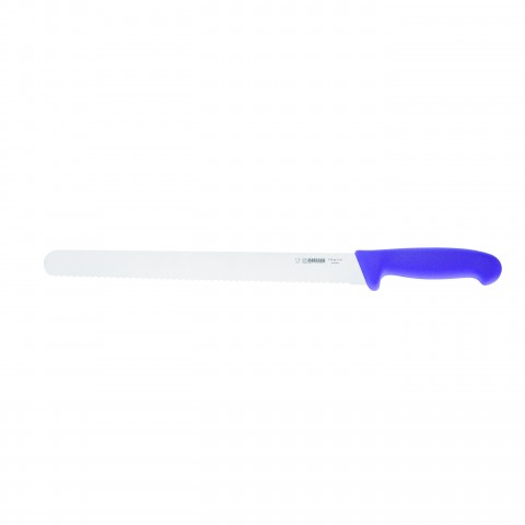 Giesser Messer Ham Knife, 12-1/4" blade length, serrated edge, allergen free, purple handle, chrome-molybdenum steel blade, made in Germany