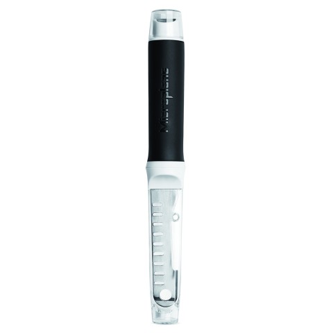 Ultimate Bar Tool, 7-in-1, includes muddler with protective cover, stainless steel blade with: hole at top for stirring drinks, strainer holes along flat edge, partial paring knife to score and cut, and channel knife, peeler on base of handle