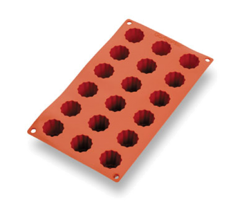 Gastroflex® Mini Cannele Mold, 18 per sheet, 1-3/8" dia. x 1-3/8"H mini canneles, sheet size 11-3/16”L x 6-7/8”W, flexible, freezer to oven, temp resistance from -58°F to 482°F, dishwasher safe, food grade silicone, made in France