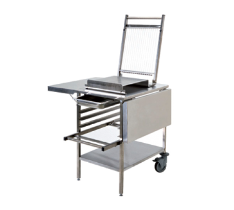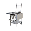 Guitar Slicer Trolley, 48-7/8" x 30-3/4" overall surface, 21-1/4" x 26-3/4" working plate, (2) folding side tables, slide out drawer (4) racks, (2) pivot wheels with brakes and adjustable cylinder, stainless steel (guitar slicer not included)