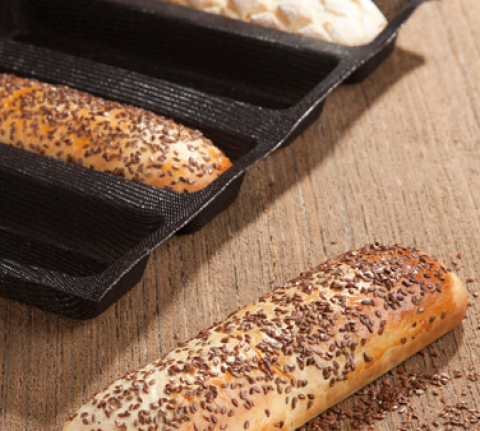 Silform® Sandwich Mold, 8 per sheet, 9-1/2"L x 2-3/4"W x 1-1/2"H, sheet size: 23-3/4"L x 15-3/4"W, heat resistant to 350°F, silicone aerated knitted fiberglass fabric, NSF, made in France
