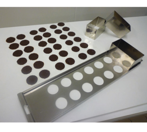 Chocolate Disc Kit, 25"L x 6-1/2"W x 3-1/4"H, makes 1-1/2" dia. plain or screen-printed discs, perforated plate, chocolate container/shuttle, all stainless steel construction, dishwasher safe