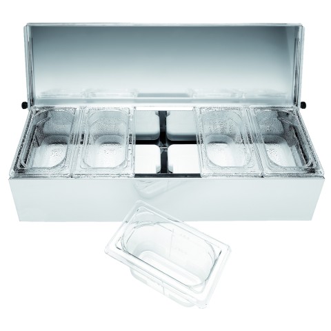 Condibox, 23"L x 8"W x 5-1/2"H, includes: (5) plastic containers, (2) cooling blocks, stainless steel