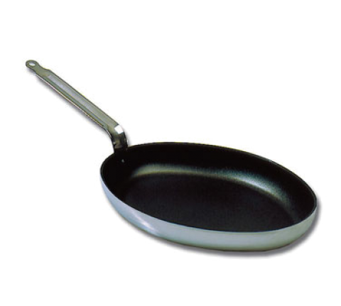Frying/Fish Pan, 9-5/6"W x 14-1/5"L, 1/6" thickness, oval, riveted stainless steel handle, 4-layer non-stick coating, aluminum with grey lacquer finish, PFOA-free, suitable for gas, electric, ceramic, and halogen hobs, except induction