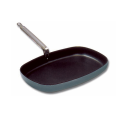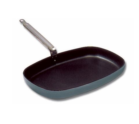 Frying/Fish Pan, 3-1/4 quarts, 15"L x 1-1/2"H, rectangular, 5 mm thickness, extra heavy aluminum, 4-layers non-stick coating, riveted stainless steel handle, gray lacquer exterior, dishwasher safe, PFOA-free, suitable for gas, electric, ceramic, and halogen hobs, except induction
