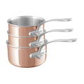 M'6S Sauce Pan Set, without lid, includes (3) sauce pans: 6-1/4" dia. x 3-1/2"H, 7" dia. x 4"H, 8" dia. x 4-3/10"H, round, non-drip edge, riveted cast stainless steel handle, non-corrosive, gas/electric/halogen/induction/oven, 2.6mm thick, 6-ply construction, 18/10 stainless steel interior, polished finish